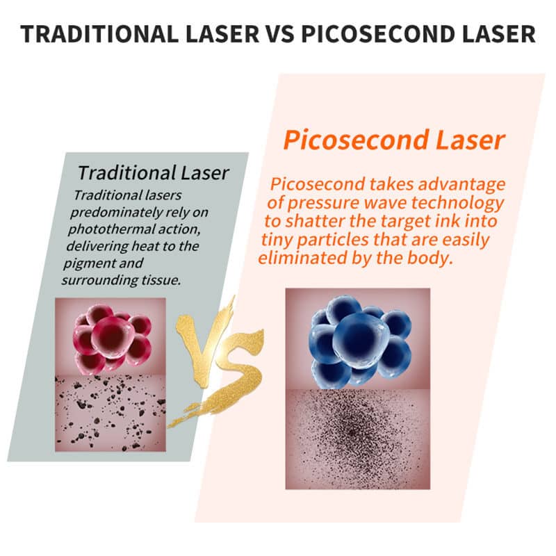 Это означает, что пикосекундные лазеры могут обеспечить более короткие сроки, более мощные всплески энергии, позволяет проводить более быстрое и точное лечение.. Но Nd с модуляцией добротности:YAG Laser может обеспечить более широкий спектр лечения пигментации..
